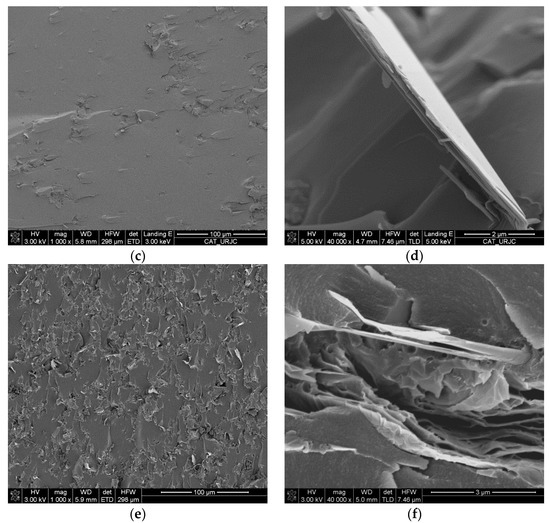 To further investigate the performance of the dispersion method, cryogenic fracture surfaces of nanocomposites were evaluated by FEG-SEM (Figure 6). Neat benzoxazine presented a smooth fracture surface (Figure 6a,b) which is characteristic of brittle materials. In contrast, nanocomposites showed a rough fracture surface (Figure 6c,e) which indicated that higher energy was necessary to produce the breakage of these samples. On the other hand, a suitable dispersion can also be appreciated in Figure 6c and e with a uniform distribution and random orientation of GNPs into a benzoxazine resin. Furthermore, these images allowed confirming that GNPs were not completely exfoliated because graphene nanoparticles with a low number of stretched graphitic layers (Figure 6d) and also some thicker aggregates at higher GNPs loadings (Figure 6f) were observed. The employment of three-roll calender produces the exfoliation of external graphene layers, leaving nanoparticles thinner than the initial GNPs [26].