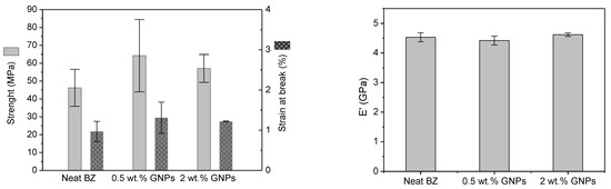 The tensile strength and strain at the break of the neat benzoxazine and its nanocomposites are displayed in Figure 7 and Table 1. The neat resin presented a tensile strength and fracture strain of 46.3 MPa and 0.97%, respectively. This property was noticeably enhanced for all nanocomposites but the highest improvement of 40% was obtained when a 0.5 wt.% of GNPs were added to the neat benzoxazine which was accompanied by a rise in the elongation at break. As it was expected, a higher GNPs content into benzoxazine favors their aggregation reducing the strengthening effect of the partial exfoliation phenomenon produced by calendering dispersion. These aggregates may cause a high-stress concentration and premature failure, so this could explain the lower increase in tensile strength (24% vs. 40%) and in the strain at break (26% vs. 35%) for the nanocomposite with a 2 wt.% in comparison with the 0.5 wt.% reinforced one. The tensile ductility increasing was also reported by Alexopoulos et al. for high filler concentrations (>1 wt.% GNPs) [27]. In contrast, the elastic modulus (E’) remained nearly constant when the matrix was modified with graphene nanoplatelets.