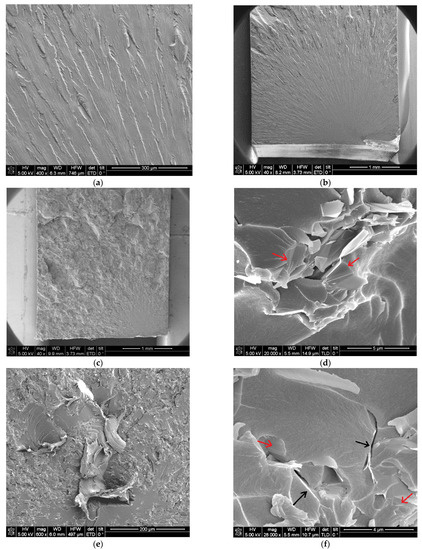 The fracture surfaces morphology was also analyzed by FEG-SEM and characteristic images are displayed in Figure 8. The neat benzoxazine (Figure 8a,b) presented a typical surface of brittle material with a smooth initial failure area and a crack propagation zone which showed “river-like” fracture patterns radially oriented from the crack initiation point. In these typical brittle materials, the crack spread at high velocity in the matrix after its initiation. Polybenzoxazine resins derived from monomeric benzoxazines have usually brittle behaviour due to several types of chain-end groups which lead to termination of the chain propagation by the intramolecular six-membered ring hydrogen bonding [28]. Similar brittle fractures of benzoxazine-type resins have also been observed by other authors [29,30]. When 0.5 wt.% of GNPs was added to neat benzoxazine the appearance of the fracture surface turned visibly different (Figure 8c). The smooth surface of the crack initiation was shorter which was related to a lower fragility and the roughness surface of the propagation area suggested that the crack progress was hindered by the stiff nanoreinforcements. When this surface was observed at higher magnifications (Figure 8d) a good interface between the matrix and graphene nanoplatelets can be appreciated based on the continuity between them. In addition, some single graphene layers bonded to the polymeric matrix (marked with red arrows) and a few nanoparticles with a low number of graphene sheets were also found. It seemed that the weak points which produced stress concentration were the GNPs aggregates whose graphene sheets remained joined by Van der Waals attraction forces, so they tend to slide between them when a load is applied. The initial failure in nanocomposites with 2 wt.% of graphene nanoplatelets was located in the middle of the specimen due to the presence of impurity or heterogeneity which presented a marked plastic behavior (Figure 8e). However, the fracture surface displayed a rougher appearance as a result of the GNPs reinforcement effect which seemed to be uniformly distributed into the matrix. In this nanocomposite, several microcracks which contained small agglomerates of several graphene sheets were also observed as well as some graphene sheets integrated into the benzoxazine (Figure 8f). It appeared that these nanoplatelets did not offer resistance to the crack propagation taking into account the fracture surface plane continuity.
