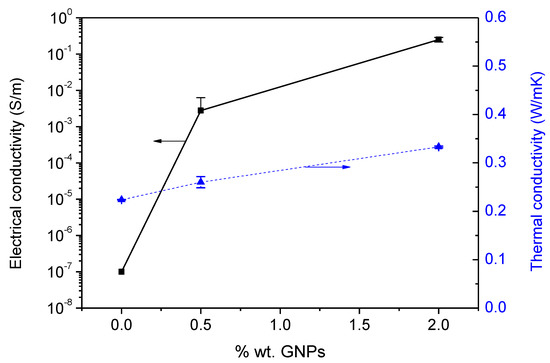 In order to achieve a full characterization of benzoxazine/GNPs nanocomposites, the electrical and thermal conductivity were also measured. The results are displayed in Figure 9. The addition of little GNPs amounts implied noticeable variations in the electrical conductivity. The percolation threshold was close to 0.5 wt.% GNPs because this was the value at which the electrical conductivity raised four orders of magnitude regarding neat resin (~10−7 S/m). The reason could be that graphene sheets are in contact with each other as a result of their high aspect ratios; hence the formation of conductive pathways through the nanocomposite could be possible. A new increase in this property until 2.5 × 10−1 S/m was achieved when 2 wt.% of GNPs were added to the matrix. This result corroborates that the higher contents of GNPs into the polymeric matrix increase the proportion of partially exfoliated sheets into the polymeric matrix which results in a higher number of physical contacts between individual graphene sheets. This creates a more stable electric percolation network which favors the transport of electric charges through the composite. In this network, nanometric dimensions of graphene sheets also favor the contribution of the tunneling conduction mechanism in absence of electric contact. Apart from this, the intrinsic conductivity of the GNPs also contributes to a marked increase in the effective conductivity of these systems [37]. Although the number of studies related to benzoxazine nanocomposites containing GNPs is scarce in the literature, the electrical conductivity achieved in this work was significantly elevated (at the same filler content) in comparison with others systems, including those with an epoxy matrix. Hence, taking into account the greater electrical conductivity of the benzoxazine nanocomposite with 2 wt.% of GNPs, it could be explored as an alternative lightning strike protection strategy for composite aircraft avoiding the current protection approach based on conductive metal meshes [38]. This solution would allow reducing the weight of composite structures and thus the fuel consumption and environmental impact. Zhang et al. could increase 400 times the conductivity of polybenzoxazine films when 1 wt.% of trichlorophenylsilane modified graphene was added to the polymeric matrix and this rapidly increased conductivity was attributed to the uniform dispersion of the nanofiller throughout the whole film [39]. Results of electrical conductivity reached by Chandrasekaran et al. demonstrated that the application of several calender cycles allows increasing nanocomposite conductivity by several orders of magnitude regarding those prepared with sonication combined with high shear mixing. In addition, the value of electrical conductivity for the nanocomposite with 0.5 wt.% of GNPs (using calender) was very similar to the one obtained in our study (2.8 × 10−3 S/m) [40]. When an epoxy resin is reinforced with 0.57 wt.% of thermally reduced graphene oxide and 0.57 wt.% of multi-wall carbon nanotubes (MWCNT), the electrical conductivity of the bi-filler nanocomposites attained to 3 × 10−3 S/m which was one order of magnitude lower than the epoxy cured nanocomposite with only 0.57 wt% of MWCNT/(7.8 × 10−2 S/m) [41].