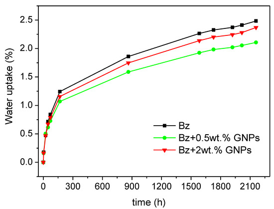 The evolution of water uptake with time is represented in Figure 10. Neat benzoxazine absorbed 2.51% of water at saturation. This value was slightly higher than the one obtained by Ishida and Allen for the benzoxazine based on bisphenol A and aniline (1.9%) [50]. In contrast, when GNPs were added to this matrix the maximum water absorbed decreased from 2.37% and 2.14% for nanocomposites with 2 wt.% and 0.5 wt.% of GNPs, respectively which entails a reduction of 15% (0.5 wt.% Gr) and 6% (2 wt.% GNPs) in the total amount of water uptake. The addition of more GNPs (2 wt.%) did not show much hydrothermal resistance compared with nanocomposite with 0.5 wt.% of nanoreinforcement. It can be explained due to the presence of some aggregates which reduce the specific surface area. In addition, the restriction to intermolecular movement has become ineffective and enhanced water absorption [51].