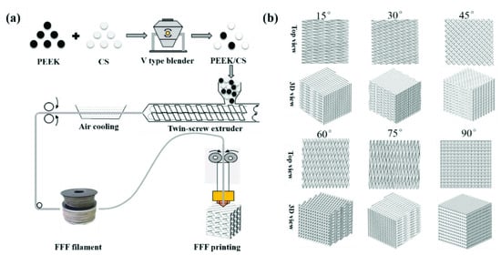 (a) PEEK/CS scaffolds fabricating process; (b) the schematic diagram of the scaffolds with different raster angle.
