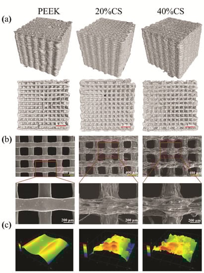 Micro-CT was used to evaluate the interconnectivity of the scaffolds, as shown in Figure 2a. No obvious defect on the 3D and top views was found, indicating that the FFF process was suitable for the manufacturing of PEEK/CS composites. Meanwhile, the pure PEEK and PEEK/CS composite scaffolds exhibited good interconnectivity, shown as the top view. The SEM results (Figure 2b) found that the pure PEEK scaffolds exhibited a smooth surface, while a coarser topography was found on the surface of PEEK/CS scaffolds. Furthermore, the LSCM was used to quantitatively measure the surface roughness. The 0.13 ± 0.04 μm was found for the pure PEEK scaffold, while the 20%CS and 40%CS scaffolds exhibited the Ra of 0.38 ± 0.09 and 0.48 ± 0.06 μm, respectively. The LSCM results (Figure 2c) demonstrated that the participation of CS particle could improve the surface roughness of scaffolds, which may be beneficial to cell attachment and spread [37,38]. Table 1 shows that pure PEEK and 20%CS scaffolds exhibited similar porosity (around 55%), while the porosity of the 40%CS scaffolds increased to 62%. This may be caused by the addition of CS particles, which improved the viscosity of PEEK material in the molten state, consequently causing the decrease of output of the nozzle. The above phenomenon finally resulted in the decrease of the porosity. In addition to printing parameters, the consistency of the scaffolds structure could be impacted by CS content. The different printing parameters should be studied to compensate for the impact of CS content variation in the future.