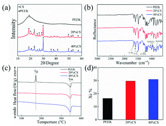 (a) XRD patterns, (b) FTIR spectra, (c) DSC curves, (d) crystallinity results of PEEK and PEEK/CS composites.