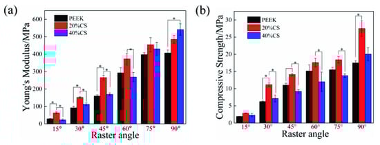 The compressive modulus is shown in the Figure 4a. The Young’s modulus of three types of scaffolds remarkably increased with the raster angle ranging from 15° to 90°. The modulus variation ranges of pure PEEK, 20%CS and 40%CS scaffolds were 28.8–406.9 MPa, 63.2–485.1 MPa and 23.3–541.5 MPa, respectively. Under the same printing raster angle, the modulus of 20%CS scaffolds was higher than that of pure PEEK and 40%CS scaffolds when the raster angle was less than 90°. Owing to the excellent hardness and stiffness of biological ceramic, the addition of CS particles generally enhanced the modulus of polymer-based composites, while the modulus of 40%CS scaffolds was lower than that of 20%CS scaffolds in this study. This phenomenon may be caused by the lower porosity of 40%CS scaffolds, as shown as Table 1. The decrease of porosity of 40%CS scaffolds could reduce the rod diameter of scaffolds and the effective bearing area under the compressive load, finally leading to the decrease of Young’s modulus. Under the raster angle of 90°, the Young’s modulus of the scaffolds increased with an increase of CS content, indicating that CS exhibits a better strengthening effect on the modulus when the compression direction was parallel to load. The compressive strength was shown in Figure 4b. Similar to the variation trend of Young’s modulus, the compressive strength of scaffolds was enhanced with the increase of the raster angle. When under the same printing raster angle, the strength first increased and then decreased along with the CS content ranging from 0 to 40%, demonstrating that the increase in porosity also reduced the compressive strength. The adjustable range of the compressive strength was similar to the variation range of the natural trabecular bone (2–17 MPa) [39,40]. Thus, the printed scaffolds exhibited potential for clinical application.