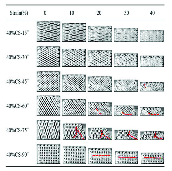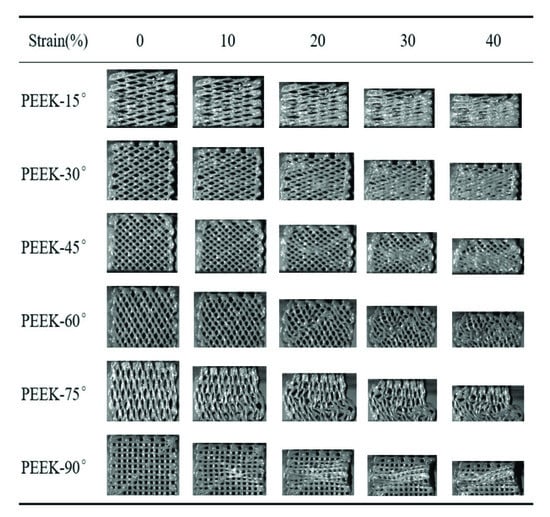 The compressive process of the pure PEEK scaffolds was recorded by a high-speed camera, as shown in Figure 5. There was a larger angle between the struts of scaffold and compressive loading when the raster angle was less than 45°. The struts could not bear the compressive load directly and the gap between adjacent struts gradually decreased. The scaffolds were finally compressed into nearly compacted solids when the strain reached up to 40%. The above deformation process resulted in a lower compressive modulus and strength, as shown in Figure 5 When the raster angle was more than 45°, the struts of the scaffold could bear the compressive load because of the lower angle between the struts and compressive load. Obvious buckling deformation of struts for the PEEK-60° when the strain reached up to 20% could be found. When the compressive load was further applied, a crush band was formed because of the accumulation of buckling deformation. Buckling deformation of the struts was found for the PEEK-75° and PEEK-90° when the strain reached 10%, indicating that a larger raster angle could reduce the strain corresponding to the beginning of buckling deformation. Benefiting from the excellent toughness, there was mainly plastic deformation for the pure PEEK scaffolds during the compressive process, and no obvious fracture was found.