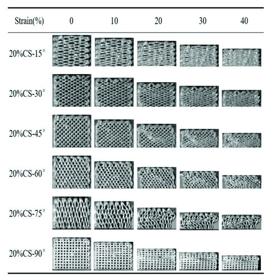 The compressive process of the 20%CS scaffolds with different raster angles.