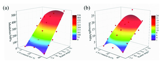 The changing law of modulus (a) and strength (b) with different CS content and raster angle.