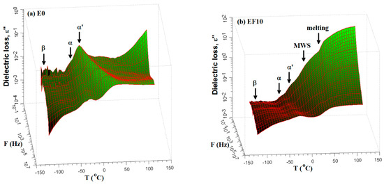 The 3D representations of the dielectric loss as a function of frequency and temperature are rpresented in Figure 9 for simple E0 sample, nonirradiated EF10 and irradiated EF10-600 composites. The diagrams allow the identification of dielectric α-, α′- and MWS-relaxations as well as the physical melting transition of crystallites. The broad band of the secondary β-relaxation is not clearly identified due to high noise presented at low temperatures.