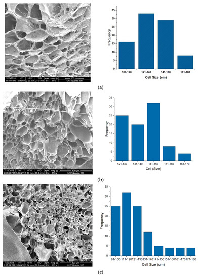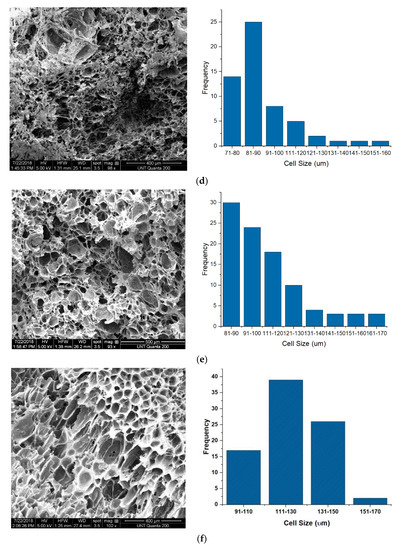 The number of cells (bubbles) in each of the micrographs obtained from the SEM was counted using the Image J Pro software. Between 100–200 cells were present in each micrograph. For greater accuracy, cells (n) were counted in four different sections of each micrograph and the area (A) was calculated in centimeter square, where M is the magnification. From these, the cell density (Nf) for each of the foams was calculated using Equation (2) below [70].