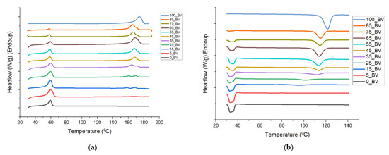 A significant increase (53%) in the enthalpy of melting corresponding to the PCL phase when PHBV was first introduced into PCL at 5 wt.% indicates a high PHBV integration into the PCL crystallite. As PHBV weight concentration increased from (5–35) wt.%, a decrease in Hm1 values was observed relative to the 5_BV, while higher than pure PCL, which indicates continued dissolution of PHBV in PCL. In this range, a splitting of peaks for the PHBV phase was observed (Figure 4a). The split indicates a peak closer to the pure PHBV melting peak at 174.1 °C denoted as Tm3 and one closer to the PCL phase was denoted as Tm2. Tm2 represents the region of interaction between the PCL and PHBV phases. Initially the peaks for 15_BV are 158.71 °C and 168.2 °C, while for 35_BV the values are 164 °C and 171 °C, which indicated that as more PHBV was added, the values moved higher towards the pure PHBV melting point of 174.1 °C. For the PHBV range between 45 and 65 wt.% concentration, the unfoamed blends indicated no change in the PCL peak, but the PHBV peak was singular and trended towards the pure PHBV phase. For 75_BV and 85_BV with the majority phase being PHBV, it can be noted that peak splitting reoccurred.