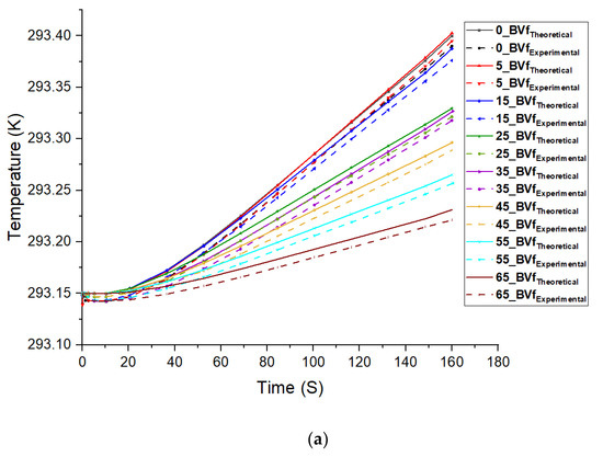 Plot of temperature vs. time for both theoretical and experimental data input for the composite foams (0–65) BVf; (showing temperature profiles at the mid-point of foams) (a) for Transient state and (b) Steady state.
