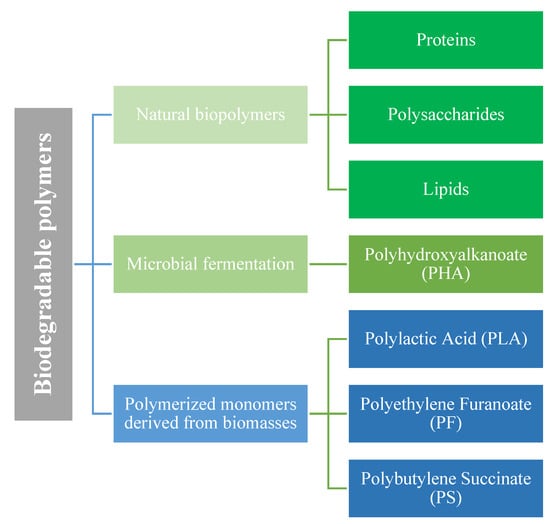 Biodegradable packaging materials are commonly generated from sustainable natural resources or from the by-products of food and agricultural products and, based on the raw material used, can be categorized into three main groups (Figure 2). These non-toxic polymers exhibit considerable mechanical and barrier properties, and can be biodegradable and compostable making them excellent candidate material for food and agricultural applications [17]. Polylactic acid (PLA), an aliphatic polyester from lactic acid or lactide monomers, is one of the most studied and prevalent biodegradable polymers with various applications in the industrial packaging sector. PLA is manufactured by the controlled fermentation of carbohydrates from different bio-sources such as corn starch or sugarcane. PLA films have a good mechanical and barrier properties but due to the slow degradation rate in mild home composting conditions and their high dependency on hydrolysis for complete degradation, they need industrial composting conditions to be degraded [18]. Moreover, PLA production is associated with a high water footprint (0.248 m3/kg) mainly due to maize cultivation [19]. Utilization of edible and nutritive plants such as corn, cassava, sugarcane, and sugar beet pulp are another drawback attributed to the industrial production of PLA. Therefore, recycling PLA into LA monomers is preferable from an energy point of view rather than producing LA from glucose fermentation [20]. Polyhydroxyalkanoate (PHA) is another bio-based polymer with good mechanical and barrier properties which is completely biodegradable. PHA is manufactured from microbial fermentation of carbon sources and nutrients under nutritional stress [21]. Nevertheless, the high price of manufacturing PHA is limiting its application in the packaging sector, therefore, it is mainly used in high added-value products in pharmaceutical or medical applications [21].