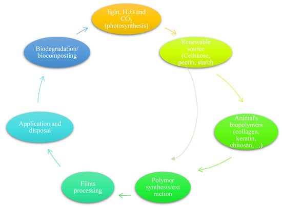 By acknowledging the serious environmental and health issues attributed to petroleum plastics, and the inevitable demand for their application in various industries, research in the development of environmental-friendly plastics has gained huge interest in the past decades [10,11,12]. Moreover, the European Union Sustainable Development Strategy [13] and the United Nations 2030 Sustainable Development Goals [14], particularly in the packaging supply chain, have accelerated the demand for shifting from petroleum-based packaging to the bio-based plastics that are more effective, safer for human, and more eco-friendly [15]. Bioplastic materials are commonly categorized in two major groups: the first group is recyclable polymers, which are partially or completely made from biological and sustainable sources such as grains, starchy root vegetables, sugar cane or vegetable oils. The second group is biodegradable plastics that can be degraded by natural microorganisms present in soil or water into carbon dioxide (CO2), methane (CH4), water, and inorganic compounds [16]. The life cycle for biodegradable packaging materials is shown in Figure 1.