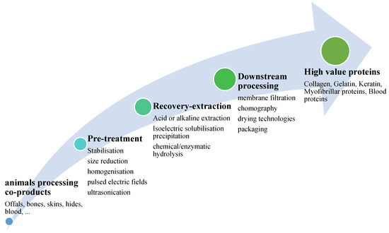 Different stages for protein’s recovery from animals processing co-products and secondary streams [64].