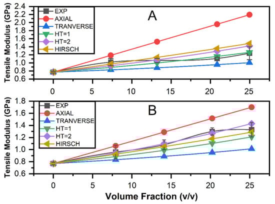 A parameter change is required to match the mathematical models with the current test results. All modifications are limited to the ROM, IROM, Halpin–Tsai, and Hirsch models. Tensile modulus predictions were made by first completing all known parameters and then entering all parameters into the model to match the data. The details of the parameter change are summarised in Table 8. Moreover, Figure 3 compares the experimental result and the value from a modified mathematical model.
