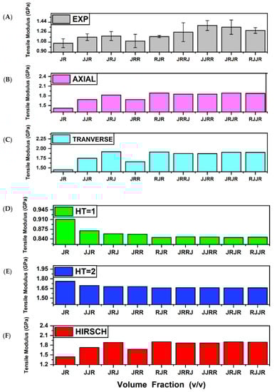 Modulus of composite hybrid: (A) Experiment (B) ROM (C) IROM, (D) HT = 1 (E) HT = 2. (F) HI.