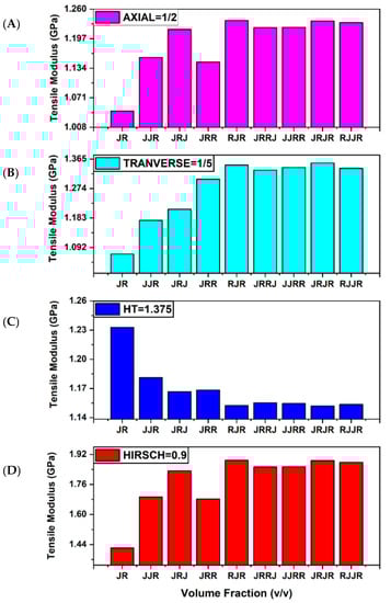 In the literature, the researcher employs various values for empiric value. Giner, Franco, and Vercher (2014) proposed an empirical value of 1.5 for the Halpin–Tsai model in their work []. A practical value of 1.5 is best suited for the random distribution of fibre with a volume fraction ranging from 22% to 55%, which is more realistic than the theoretical square array distribution. The 1.375 empiric value of the Halpin–Tsai model is best suited to the experimental value in the current work.
