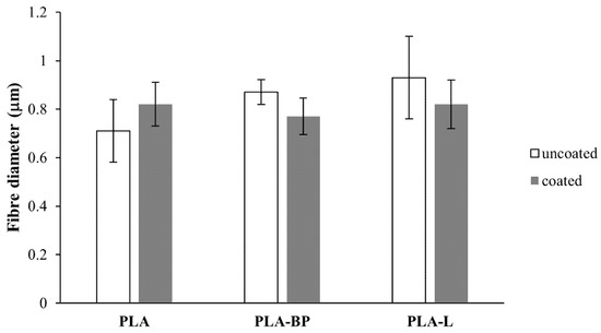 The mean diameter of the PLA-based fibres is reported in Figure 3. No statistically significant differences can be observed in the fibres’ diameter before and after CS treatment, indicating that the CS coating did not alter the size of the fibres.