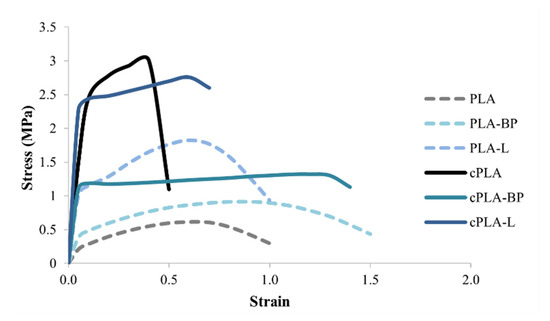 Average stress-strain curves of uncoated (PLA, PLA-BP and PLA-L) and coated (cPLA, cPLA-BP and cPLA-L) fibres (mean value ± s.e.; n = 3).