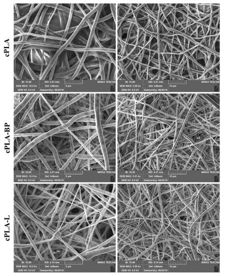 The stability of the CS-coated fibres was assessed after soaking them in deionized water for 7 days (Figure 6). The morphology of the fibres remained almost unchanged, pointing out the stability of the fibrous membranes in aqueous solutions. In particular, the nano-pores on the surface of cPLA-BP and cPLA-L fibres were still closed, indicating that the CS coating persisted on the fibres’ surface.