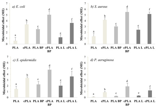 The microbicide effect (ME) of both coated and uncoated fibres was evaluated on four different bacterial strains (S. aureus, S. epidermidis, E. coli and P. aeruginosa). Black pepper essential oil is known to be effective against S. aureus and E. coli at a Minimum Inhibitory Concentration (MIC) of 1–2 mg/mL [50,51,52], while MIC values in the range of 4–8 mg/mL have been reported for limonene against S. aureus, E. coli and P. aeruginosa [53]. It is therefore expected that the addition of the EOs imparts antibacterial properties to the PLA fibres. Indeed, the ME values recorded for PLA-BP fibres and PLA-limonene ones are considerably higher than the ME of pure PLA samples. The CS coating worked synergistically with the EOs and further enhanced the antibacterial properties of the electrospun membranes (Figure 7), due to the bactericidal effect of chitosan on gram-positive and gram-negative bacteria [54,55]. For all the microorganisms considered, the CS-coated fibres were characterized by ME values significantly higher than those of coated fibres. Among the coated fibres, cPLA-BP mats showed the highest antibacterial activity against all the microorganisms considered, pointing out the microbiocidal effect of the CS coating.