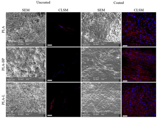 Microphotographs of fibroblasts grown on PLA, PLA-BP, PLA-L fibres, uncoated and coated, for 7 days: SEM images and confocal-laser scanning microscopy (CLSM) (nuclei in blue, Hoechst 33258; cytoskeleton in red, TRICT-phalloidin). Scale bars: 20 µm for SEM images, 50 µm for CLSM images.