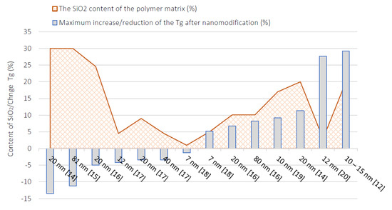 The glass transition temperature (Tg) of obtained FRP composites for different contents of SiO2. Literature review [12,14,15,16,17,18,19,20] for different diameters of nanosilica: 7–81 nm.