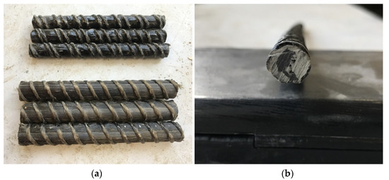 Before proceeding to the shear test, all samples were cut into 300 mm sections: five samples for each type of bar, diameter, and each temperature, totaling 135 samples. Next, they were measured, weighed, and the equivalent diameter of the bar was determined. The surface assessment of the bars showed some imperfections (Figure 3), including uneven resin coverage as well as the cross-section of the bar having an asymmetric offset of the carbon fibers from the core.