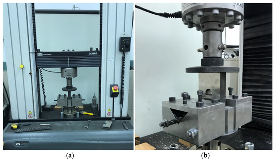 The shear test: (a) shear machine mounted in the testing machine; (b) the sample holder with a longitudinal V-shape cut for placed FRP.