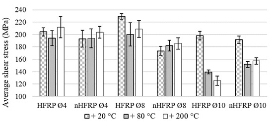 The FRP bars with the nanomodified matrix had, at room temperature, a negligible impact on the strength parameters of the bars in relation to the unmodified bars, in a range less than 5% (Figure 6). On the other hand, for Ø4 nHFRP bars, the decrease of average shear strength at room temperature in relation to HFRP was 24%, and about 10% after heating. A different phenomenon occurred in the nHFRP bars Ø10, which showed an increase of shear strength of 9% after heated to 80 °C for 2 h and 25% after heated to 200 °C. The influence of the modification performed was analyzed with influence of temperature due to the monitoring of the behavior of nanosilica during the preheating process.
