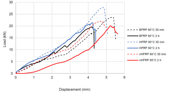 The results obtained in the shear test for bars heated for 2 h at the temperature of 80 °C were compared with the previous results of the shear test performed after heating the bars at the temperature of 80 °C for 30 min [3]. The differences in the transferred shear force and failure displacement were insignificant, while the heating time significantly reduced the failure time of the bar (Table 3), with time reduction ranging up to 42–52%. The test results showed reduction failure times for each type of bar: BFRP, HFRP, and nHFRP. This means that the composite destruction occurs much more rapidly when the bar is pre-heated. This reduce-time phenomenon should be included during the design of concrete elements reinforced with FRP bars. In the course of research, an exclusive focus on force reduction is not a desirable approach.
