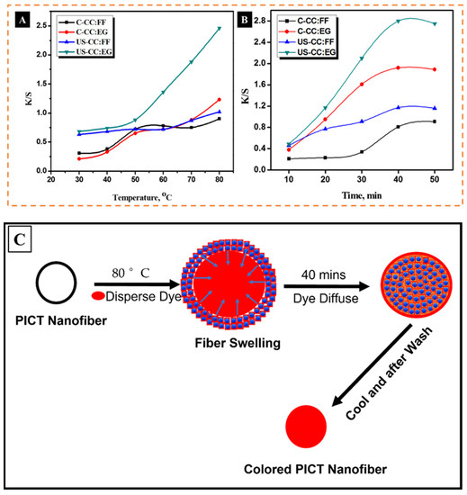 PICT nanofibers were dyed with C.I. disperse Red-167:1 by ultrasonic and conventional methods at different temperatures. The dyeing temperature of PICT nanofibers was studied in the range of 30 °C to 80 °C by keeping the time constant at 30 min. Figure 1A shows the effect of dyeing temperature on the color strength of dyed nanofibers in both dyeing methods. The color strength of dye increased gradually with increasing dyeing temperature in CC:EG solvent from 30 °C to 50 °C and a rapid increase was observed from 50 °C to 80 °C, whereas in CC:FF solvent a slower increase in color strength from 30 °C to 60 °C and a rapid increase from 60 °C to 80 °C was observed. The higher color strength was observed in CC:EG solvent as compared to CC:FF solvent in both the ultrasonic and conventional methods, respectively. However, the ultrasonic dyeing in CC:EG solvent achieved a remarkable color strength. The ultrasonic dyeing of PICT nanofibers revealed higher color strength as compared to conventional dyeing. The high color strength of ultrasonically dyed samples is due to accelerated hydrolysis of deep eutectic solvents which increased the dye diffusion rate [25]. The mechanism of dye diffusion is explained in Figure 1C. Based on the above outcomes, 60 °C was chosen as an optimized temperature for both processes.