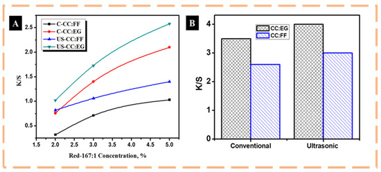(A) Color buildup properties of Red-167:1 with respect to different concentrations. (B) Color build-up properties in the conventional, and ultrasonic methods.