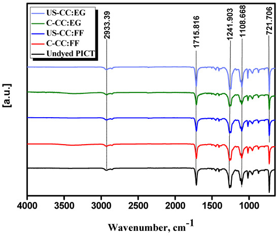 An FTIR spectroscopy was carried out to examine the change in the chemical structure of the dyed and undyed PICT nanofibers shown in Figure 3. The stretching peaks at 1715 cm−1 and 1241 cm−1 confirms the presence of C=O and C-O in dyed and undyed PICT nanofibers. The spectra further showed the stretching of C-O at 1108 cm−1. The bending peak at 721 cm−1 confirms the presence of C=C in PICT nanofibers before and after dyeing. The functional groups of Red-167:1, CC:EG, and CC:FF could not be observed because a small number of respective chemicals were utilized to carry out the dyeing process and were rinsed well after dyeing [29]. Ultimately, it was confirmed by FTIR that PICT nanofibers can be dyed in the presence of deep eutectic solvents without altering the chemical structure of the PICT nanofibers.