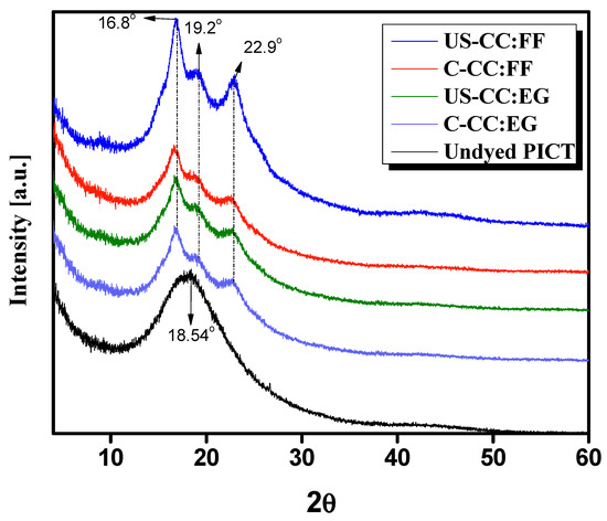 To analyze the PICT nanofiber’s properties, it is necessary to perform the XRD on dyed and undyed samples. Figure 4 shows the XRD patterns of undyed PICT nanofibers and PICT nanofibers dyed in different media of DE solvents. Undyed PICT shows intensive peaks at 18.5° with d-spacing (4.6 A°) and dyed PICT with CC:EG either conventionally or ultrasonically showed the same peaks at angles 16.8° and 22.9° with d-spacing (5.2 A°) and (3.7 A°), respectively. Whereas, conventionally dyed PICT with CC:FF shows peaks at the same angles as dyed the PICT in CC:EG but ultrasonically dyed PICT in CC:FF shows the peak at 16.8° with d-spacing (5.2 A°) but at angle 22.9° showed a more intensive peak with d-spacing (3.7 A°), respectively. The distance between the molecules in the chemical chain increases due to the decreasing diffraction angle in ultrasonically dyed samples but there were no effects found in the properties of PICT nanofibers [30].