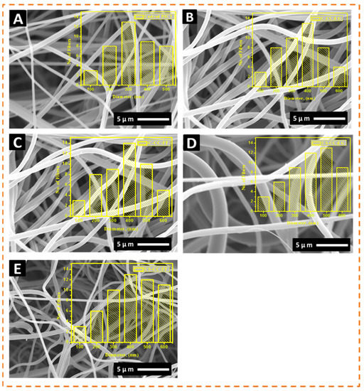 SEM image inside histogram of undyed PICT nanofibers (A), PICT nanofibers conventional dyed in CC: EG (B) and dyed in CC: FF (C), PICT nanofibers ultrasonically dyed with CC: EG (D) and CC: FF (E).
