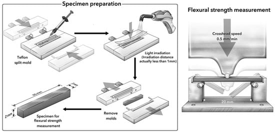 Specimen preparation and measurements of flexural properties were conducted in accordance with ISO 4049 with a Teflon split mold (25 × 2 × 2 mm), which was developed by Irie et al. [21] (Figure 1), rather than in a stainless-steel mold. When attempting to measure flexural properties at the initial stage after polymerization, a Teflon split mold can minimize the stresses exerted on the specimen during removal from the mold. The composite was placed into the mold, the upper surface closed with a clear matrix strip (Epitex, GC), and the material pressed with a glass plate under a 5 N load. The exit window of a light-emitting diode (LED) dental curing light (Elipar Deep Cure-S LED curing light, 3M Oral Care) was placed against the glass plate and the sample light-cured with a total radiant power of 352,800 mJ/cm2 (1470 mW/cm2 × 40 s × 3 overlapping sections × 2 sides). Then, specimens were carefully removed from the mold and polished. For each condition for each material, 10 specimens were prepared.