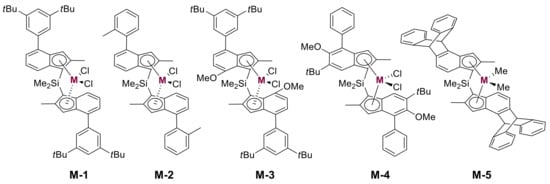 - Nifant’ev, I.E.; Ivchenko, P.V.; Bagrov, V.V.; Churakov, A.V.; Mercandelli, P. 5-Methoxy-substituted zirconium bis-indenyl ansa -complexes: Synthesis, structure, and catalytic activity in the polymerization and copolymerization of alkenes. Organometallics 2012, 31, 4962–4970. [Google Scholar] [CrossRef]