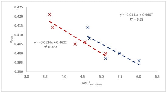 It should be noted that the stereoselectivity (ΔΔG‡ exp, stereo) of the hafnocenes at 100 °C follows solely electrophilicity trends, as measured by qMCl2, NPA (R2 = 0.87; Figure 2), much better than zirconocenes (R2 = 0.69; Figure 2). As a matter of fact, the QSAR model for predicting the stereoselectivity of zirconocenes at 100 °C is based on the mathematical combination of two descriptors: (1) a 3D-steric descriptor, measuring the difference in buried volume of the occupied and empty quadrants of the catalyst active pocket (Δ%VBur, see Table 2) and (2) an electronic descriptor being the natural population analysis (NPA) charge on the metal dichloride fragment (qZrCl2, NPA, see Table 1), introduced for accounting for the occurrence of chain epimerization [32]. The nice correlation for hafnocenes between ΔΔG‡ exp, stereo and qMCl2, NPA in Figure 2 indicates that at 100 °C chain epimerization is the dominant stereoerror source for Hf-based metallocenes.