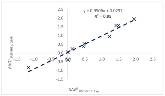 Correlation of experimentally observed ratio of allyl to vinyl chain ends (modeled as ΔΔG‡ BME-BHET, Exp) at 100 °C and QSAR-predicted ratio (ΔΔG‡ BME-BHET, QSAR) for catalysts Hf-1 to Hf-5 and Zr-1 to Zr-5.