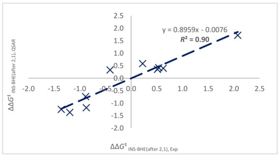 Correlation of experimentally observed ratio of 2,1 to 1,3 insertions (modeled as ΔΔG‡ 2,1INS-BHE, Exp) at 100 °C and QSAR-predicted amount (ΔΔG‡ 2,1INS-BHE, QSAR) for catalysts Hf-1 to Hf-5 and Zr-1 to Zr-5.