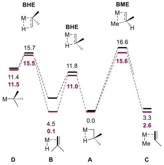 Instead, at higher temperatures and/or moderate monomer pressures, as were applied in this study, monomolecular processes like BHET and/or BME typically become rate limiting for chain transfer. It is important to realize that BHE and BME are the microscopic reverse of insertion into an M–H or M–C bond, respectively. It is long known that olefin insertion TSs are geometrically very early for metallocenes; consequently, the elimination processes (the reverse) are late, and the corresponding TSs have a M–R(olefin) character (R = H or Me) [54,71]. This implies that M–C bonds’ strength arguments do not apply under these conditions as the M–Cchain bond is barely elongated and the M-Colefin bond barely formed (or, viewed from the elimination point of view, the bonds are fully formed and completely broken, respectively).