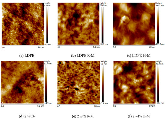AFM images of the LDPE (a–c) and 2 wt% composites (d–f) with height maps.