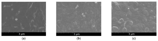 Figure 2 shows the contrast SEM of the LDPE before and after magnetization. As can be seen in the figure, magnetic-field treatment had little effect on the morphology of the LDPE. The reason is that LDPE has a homogeneous structure, so there was no interface problem. Figure 3 shows that the BiFeO3 particles agglomerated in the LDPE matrix, since the particles are clearly visible. After high-temperature magnetization (Figure 3c), there were BiFeO3 nanoparticles following a certain direction on the section, and the number of nanoparticles was more than can be seen in Figure 3a,b. The reason is that when they were magnetized at high temperature, there was enough space for the free arrangement of the nanoparticles and LDPE matrix. Under the action of the magnetic field, there were magnetic dipoles in the magnetic particles, which interacted with each other to form a multipolar magnetic moment. The magnetic force between particles was anisotropic, which made their magnetic moment arrange end to end, so that the particles were close to each other [20]. However, this phenomenon cannot be seen in Figure 3b (room-temperature magnetization). The reason was that it was difficult for the macromolecules of the LDPE matrix to move, and the nanoparticles could not be rearranged when magnetized at room temperature. Therefore, the SEM images of samples magnetized at room temperature are similar to those of unmagnetized samples.