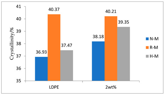 The left side of Figure 4 shows a DSC histogram of pure LDPE, room-temperature magnetization, and high-temperature magnetization. When considered with the data in Table 1 (N-M: unmagnetized), we found that the crystallinity of the LDPE increased after magnetization at room temperature or high temperature. The reason was that the magnetic field changed the intermolecular and intramolecular forces of the LDPE, and the orientation of the macromolecules was easily changed [21]. The orientation was enhanced, and anisotropy was induced along the direction of the magnetic field. The alignment of the LDPE chains or bundles became more regular, which led to the increase in crystallinity of the samples after magnetization. In the case of high-temperature magnetization, the ability of the molecular motion was enhanced and it was easier to induce directional alignment under the action of the magnetic field. Therefore, the crystallinity of the LDPE samples magnetized at high temperature had a greater increase.