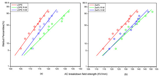 Weibull distribution of AC breakdown between the LDPE and composites under different magnetization conditions. (a) is the Weibull distribution of LDPE. (b) is the Weibull distribution of BiFeO3/LDPE composite. Curves LDPE and 2 wt% indicate no magnetization treatment. R-M is room temperature magnetization. H-M is high temperature magnetization.