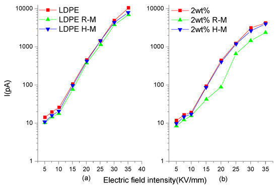 Figure 6a,b show the conductivity current characteristic curves of the LDPE and composites at different magnetization temperatures. It can be seen in Figure 6a that after room-temperature magnetization and high-temperature magnetization treatment, the change in conductivity current for the LDPE was not obvious, and the conductivity current only decreased slightly compared with that of the LDPE without magnetization treatment. This was because LDPE is a non-polar material, and its main conductivity form is ionic. Magnetization treatment can improve the crystallinity of LDPE, increase the area of crystalline region, and decrease the size of amorphous region. Carriers mainly transport in the amorphous region, which is not conducive to ion migration, and leads to the decrease of ionic conductivity. It can be seen in Figure 6b that the conductance current decreased after magnetization. This was because high-temperature magnetization led to recrystallization in the composite, which led to a change in internal structure and an enrichment effect. This led to the deterioration of the conductivity of the composite.
