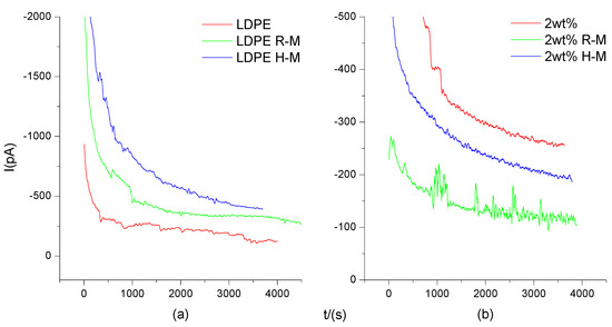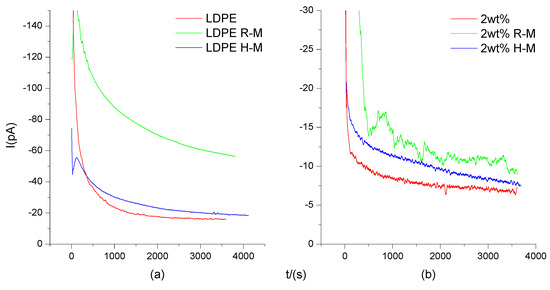As can be seen in Figure 7, under an electric field intensity of 10 kV/mm, the current of LDPE and composites decreased with the increase of time. The attenuation of the LDPE current was slower than that of the composites’ current. The attenuation of the magnetized samples’ current was slower than that of the unmagnetized samples current. When the electric field intensity was less than 10 kV/mm, the injection of space charge was very small. Therefore, the current was mainly determined by the fast charging current, the slow polarization current, and the steady-state conductance current. The polarization current included interface polarization, BiFeO3 magnetic domain switching polarization and, hot ion polarization. The polarization current decayed with time.