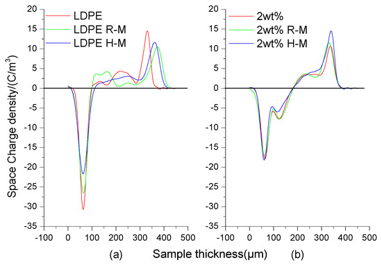 As can be seen in Figure 9, under an electric field of 40 kV/mm, the space-charge accumulation of the LDPE was obvious, the space-charge accumulation of the unmagnetized LDPE was the most obvious, and the space-charge accumulation of the room-temperature-magnetized and high-temperature-magnetized LDPE was less. The reason was that the LDPE was more susceptible to the effect of the external magnetic field producing induced dipoles in the molten state. The molecular chain arrangement was more orderly. The crystallinity increased, and crystallization tends to be directional. The space-charge accumulation of the BiFeO3/LDPE nanocomposites was less. This was because the addition of nano-BiFeO3 increased the interface region of the composites, and provided more dense trap energy levels and numbers. At the same time, the restricted current carrier induced a homopolar charge aggregation in the local region of the polymer. Since this phenomenon forms a reverse electric field, which partially counteracts the applied electric field, it improves the electric field strength of charge injected into the material from the electrode. So, magnetization had little effect on the space charge.